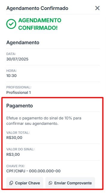 Quando essa opção estiver habilitada, na tela de confirmação do agendamento, o sistema mostrará para o cliente uma chave PIX e o valor total para pagamento.