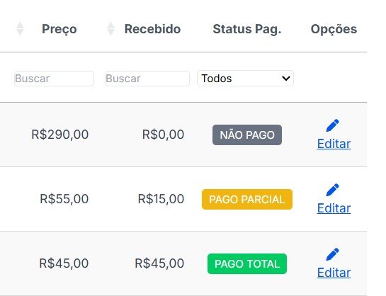 - Pago Total (verde): a soma de pagamentos é igual ao valor do agendamento.